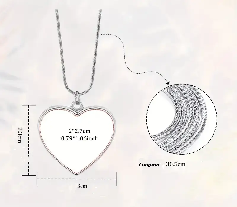 Ce collier en coeur avec incrustations de sublimations est bien plus qu’un simple bijou. Conçu avec une attention minutieuse aux détails, il incarne l’élégance et la sophistication, parfaitement adapté à toutes les occasions, qu’il s’agisse d’un dîner romantique, d’une sortie entre amis ou d’un événement spécial. Le design en forme de cœur symbolise l’amour éternel, tandis que les incrustations scintillantes apportent une touche de glamour subtil.