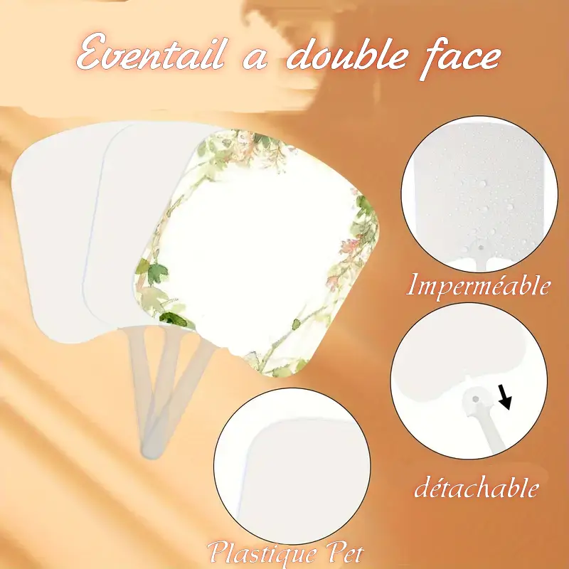 Ce modèle innovant se distingue par sa compatibilité avec le processus de sublimation. Vous pouvez parfaitement adapter l’Éventail Double Face selon vos envies en y imprimant vos motifs, logos ou designs préférés. Que vous soyez un particulier cherchant une touche personnelle ou un professionnel souhaitant promouvoir sa marque, cet éventail devient une toile parfaite pour exprimer votre créativité.